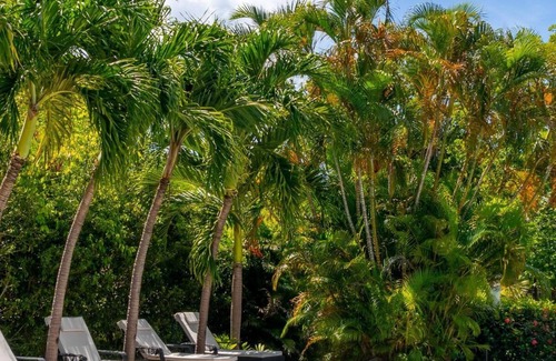 A noteworthy feature of the villa is its thoughtful single-level design, offering easy accessibility for all. A gentle step into the inviting bedrooms and stairs leading to the pool area are the only variations in elevation, ensuring everyone's comfort. The villa seamlessly opens onto a fully equipped bar and a covered patio, where moments of relaxation intertwine with the melodies of island living. This space overlooks an inviting pool deck, a charming gazebo, and lush, mature tropical gardens—painting a picture-perfect backdrop for your island sojourn.