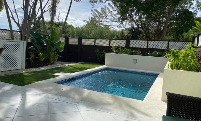 From here you can open the french doors which lead out onto the large covered terrace where you can enjoy al fresco dining, BBQ fish from the local fish market or why not get comfy in 'kindle corner' a perfect spot for curling up with your kindle & a cold Banks beer whilst listening to the birds, watching the green monkeys or spotting the beautiful hummingbirds and fire flies which visit our lovely garden daily. New for November 2021 is our very own small but perfectly formed private pool!