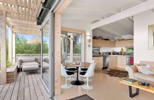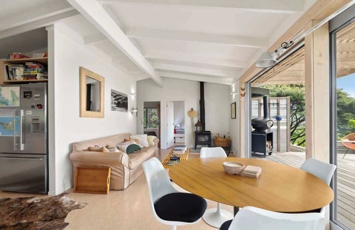 The cottage is stylish and comfortable with all the modern conveniences required for a relaxing holiday by the sea. The lounge, kitchen and dining area is open plan with large sliding glass doors leading to the large deck and covered outdoor seating / BBQ area. There are two double bedrooms and one bathroom in the main house with a third bedroom and second bathroom each accessed externally from the back of the house. Guests love the outdoor shower, private gardens and proximity to the beach at this lovely bach.