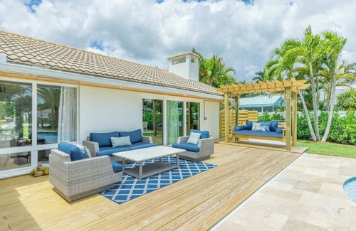 Palmetto River House with a Private Boat Dock. The dock is equipped with a cleaning station, electric, & water for your watercraft. Relax & swing under the large private Tiki Hut while watching your favorite show & eating your favorite meal fresh off the grill. Located in North of the Roosevelt Bridge on a canal with access to Saint Lucie River, private dock has fish cleaning station, beautifully remodeled Fully Furnished and decorated, a dream updated kitchen with a Stainless-Steel Glass Top Stove & Oven, Florida Sitting Room with a built-in cocktail bar, and tranquil patio with Outdoor Bed next to the gorgeous private saltwater pool. Tiki Hut that's equipped with 2 swings and a Large Screen Outdoor TV. Located minutes from historic Jensen Beach and Stuart. Only less than hour drive from West Palm Beach.