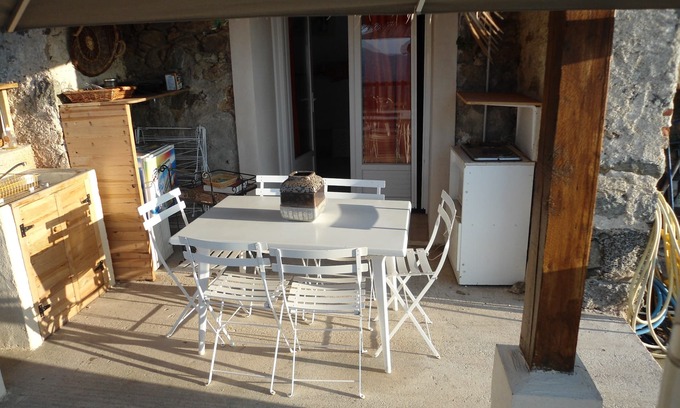 apartment on 4 levels well equipped. 140 bed mezzanine for two people. l entrance dining room american kitchen. bathroom shower and wc. a floor below storage a 90 bed. l floor which gives on the terrace two beds in 90. equipped terrace sink hot plates oven microwaves fridge freezer table chairs. barbecue parasol. a small garden of 30m2 WITH LONG CHAIRS. the place is very quiet is 80 meters from the village square where there is a bakery grocery post hairdresser two bars fast food the butcher once a week a doctor a pharmacy. 10 km from the sea and 14 km from a small town ILE ROUSSE large area is a seaside resort. 40 km from CALVI port and airport. on LOZARI beach jet ski catamaran horse riding ect. belgodere is a pleasant village a crossroads near the sea and mountains. everything is possible from the terrace you have unforgettable sunsets. Good holidays
