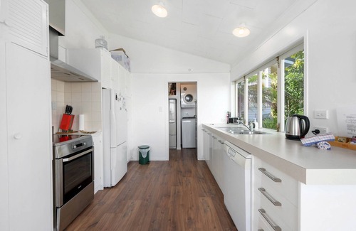This character home offers three bedrooms, comfortably accommodating up to eight guests. Wake up in the master bedroom to garden views from your queen bed, while the second bedroom offers a queen and single bed, and the third features a bunk with a single on top and a double below, overlooking a spacious backyard.