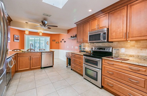 Enjoy dolphins, manatee, and exotic bird life right outside your door. Close to major shopping centers. This house is situated on a quiet residential street with the back view facing a beautiful water canal directly off the south channel to the gulf of mexico, a short 10 minute ride. Your backyard also includes a gorgeous pool and spa surrounded by a travertine deck with composite decking down to a private dock for your boat or kayak. (we provide the kayaks) (there are local rental for boats nearby). There is a screen room steps away from the pool that has a lounging and sitting area. This lovely property has 3 bedrooms and 2 bathrooms, with kitchen, dining, and living room. There is a gorgeous florida room that has lovely views of the back yard area. The plantation blinds throughout the home really give this place the Florida Vibe!! The grand appearance of the cathedral ceilings in the living room really make you feel the airy and open space of the home, along with a large flat screen TV. The florida room also hosts a separate flat screen TV, along with a comfy place to sit while gazing over the water views. The master bedroom equipped with a flat screen TV, and a king size bed has a beautiful walkin shower and closet. Along with the toilet it also has a buday and urinal. There is an additional office/study room off the master bedroom that has a fold out couch for extra visitors or just a quiet place to hang out. The two other bedrooms and bathroom are located at the other end of the house. Bedroom two is equipped with king size bed, along with a private slider door out to the back deck. And bedroom three has two twin beds. The home has bamboo flooring throughout with tile in the kitchen, baths, and florida room. The kitchen has a sky light at it's center surrounded by lovely cabinetry, stainless steel appliances, a butcher block, and of course the wine cooler. The pool has seating within so when your taking a dip and want to sit and have your beverage you can. Also seating in the spa pool too. Relax and listen to the waterfall from the spa area to the pool. Ahhh...feel the calm. There is also a pool heater available for the colder months. Please mention you need the heater so we can turn it on for your arrival. A Note: The pool and spa are heated together and they cannot be set to heat separately. This is not a hot tub situation as the temp of the spa will be same as temp in the pool. (Please note there is an additional charge of $250.00/week for this amenity.) And for you water enthusiasts we have two kayaks available for your use. Travel around the canals or out to the gulf for some fishing or just enjoy the water life and the many varieties of fish and birds that you'll pass by.