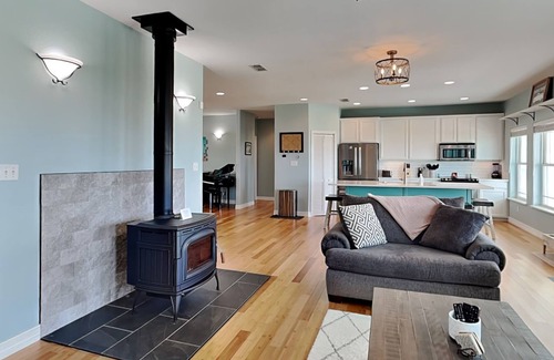 Inside, the inviting living room features cozy couches, a smart TV, and a fireplace for a relaxing vibe. The fully-equipped kitchen is a chef’s dream, with a breakfast bar, a large dining table, and a coffee bar to start your day right.