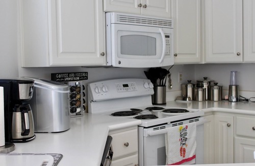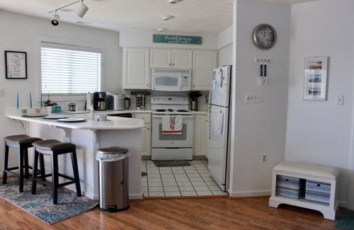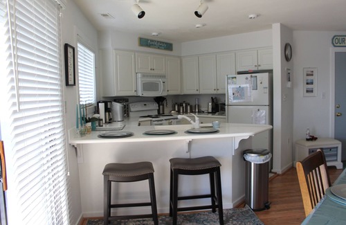 This newly renovated condo offers a fully equipped kitchen with all the extras. Curl up on a cozy couch by the fire place. Dine at the bar or table. Rest in the king master suite with a large private bathroom. The guest bedroom features two twin beds. Convenient to everyone is a full bathroom and washer/dryer combo. WiFi is available and each room has cable TV.