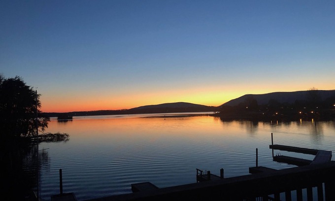 Wake up to breath taking views of the sunrise over the mountains through the glass front condo. Experience a relaxing paradise by the sparkling lake on a large deck in a relaxing swing.