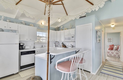 The open concept living/dining/kitchen area is quaint as can be with cottage-style décor and a charming parasol at the end of the kitchen counter. The living area features a very large television, cable TV/WIFI, and DVD player with Netflix capabilities (bring your own login/password) for guest use. The kitchen features an open bar area for cool drinks while the chef prepares a fresh shrimp dinner for the family!