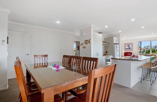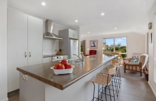 With a huge single level footprint, this Pohara Beach holiday home comfortably accommodates up to eight guests. The four bedrooms are configured perfectly for both family and friend getaways, with the master featuring a king size bed, and the remaining rooms able to sleep couples, singles, and children. The two generous sized bathrooms are stylish and spotless, with plenty of storage and vanity space.