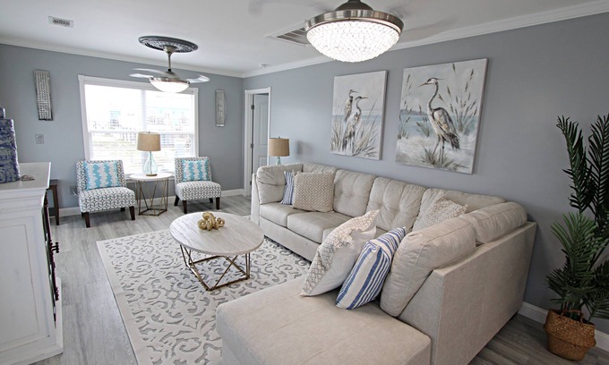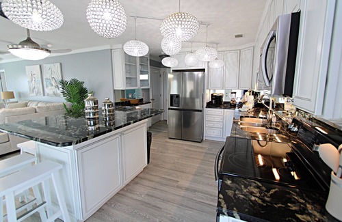 Imagine yourself seated on the balcony, watching the sunset after a day filled with sun and sea. The interior space offers modern flair, ample room, and a functional layout. The living room features a comfortable sofa that transforms into a sleeper, along with a new flat-screen TV. The generously sized, fully stocked kitchen seamlessly connects to the living area, making it an ideal space for entertaining. The Master Suite includes a dreamy king bed and a beautifully tiled walk-in shower. Both guest bedrooms are equipped with bunk beds, each having a full bed on top and bottom with a pull-out trundle bed. These bedrooms share a hallway bathroom.