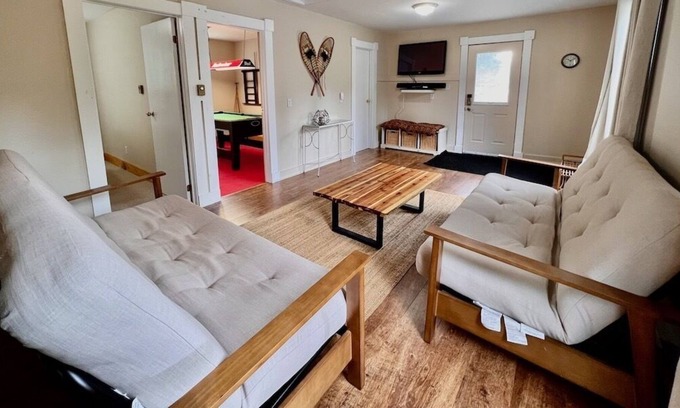 Sleeps 8, 3 Bedrooms + Bunkie, 1 Bathroom, Private, Flat Property, Child/Elderly Friendly, A/C for Cottage and Bunkie, WiFi, Washer and Dryer, Indoor Gas Fireplace, Games Room with Pool Table & Air Hockey, Sandy Beach, Great Swimming, No Weeds, Walk-In Entry, Fire Pit, Cell Reception, Great Fishing, Canoe, Paddle Board, 2 Adult Kayaks, 2 Children’s Kayaks, Outdoor Basketball Net,Tether Ball, Natural Gas Barbecue, Includes Cleaning Service (included at end of vacation dates), Winter Accessible, No Pets