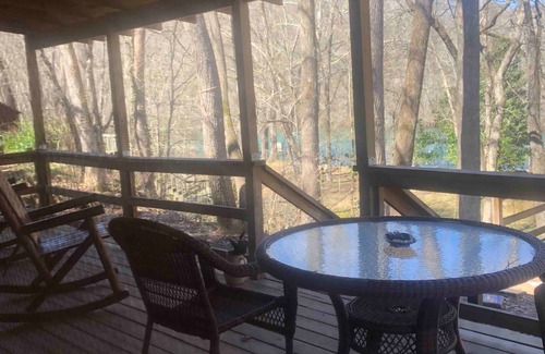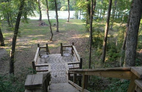 Steps and platforms meander down from the cabin's woodsy back deck to the banks of the river. There is a large cleared area between the deck and river. It’s perfect for driving down the access road to fish right from your tailgate, with a small campfire ring, and open room to play for little ones. The world record German Brown Trout was caught within a half mile of the cabin and boat rental and fishing guide service are available right down the lane. Excellent fly fishing opportunities abound. With boating lane at our bank, and a rocky shoal leading all the way across to the river’s opposite shore, you have prime conditions for dam release levels or low water wading. Make certain to view pictures of lunker trout caught by 2011 guests within one-mile of the cabin, at Cow Shoals.