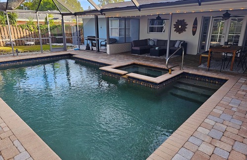Escape to Paradise Palms - experience the perfect family getaway! Enjoy an unforgettable stay just minutes from beautiful Anna Maria Island. Our luxurious home features a large lanai w/outdoor eating, pool with integrated hot tub, and garage game room with ping pong, foosball and cornhole. Conveniently located minutes from Robinsons Preserve, GT Bray, Fort Desoto and more. With 1 king, 2 queen, 2 full beds and tiled walk in shower, our home sleeps 10 comfortably. Make memories that will last!