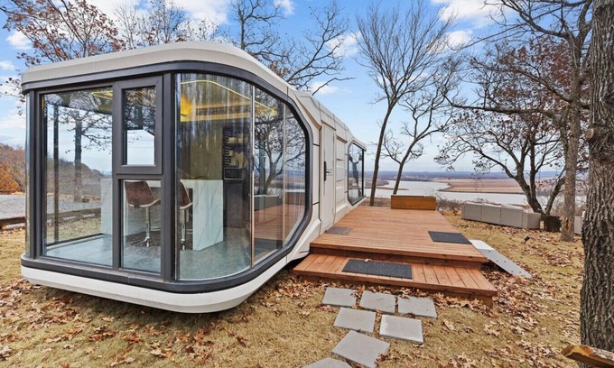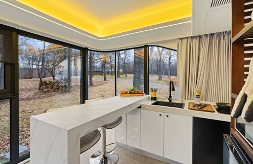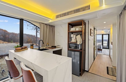 Perched atop a mountain, Vessel E7 is a sleek, container-style retreat combining cutting-edge design with nature's raw beauty. This off-the-grid sanctuary offers stunning views of a tranquil river and rolling countryside, perfect for those seeking peace and modern comfort. Whether enjoying coffee on the deck or soaking in the sunsets, this unique getaway is ideal for design lovers and nature enthusiasts alike.