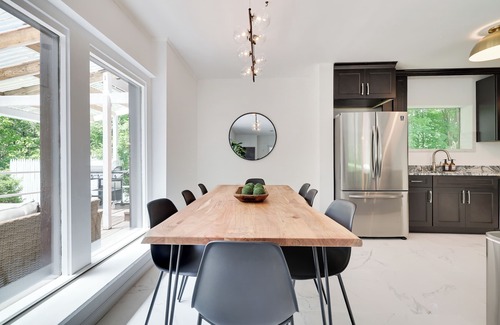 Step inside to discover the open-concept living, dining, and kitchen area adorned with marbled flooring and floor-to-ceiling windows that bathe the space in natural light. The completely renovated kitchen is a chef's dream, boasting an island with barstool seating and stainless steel appliances. Relax in style in the living room, where an electric fireplace adds a cozy touch while the 82’’ TV promises endless entertainment. A second living area with cozy lounge chairs and a couch provides plenty of space for your group to spread out. For the younger guests, the kids' play area is a delightful forest-themed room with a chalk wall, play tent, toys, books, a kids' table, and floor cushions.