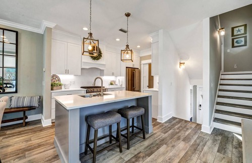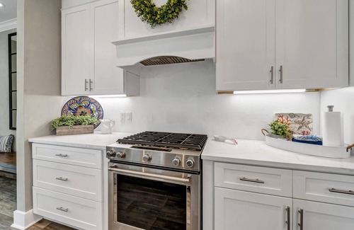 -Beautiful custom kitchen with quartz countertops and fully stocked with cooking & serve ware.