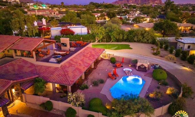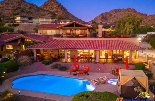 This custom mountainside mansion in Paradise Valley has a wrap-around balcony with endless mountain and city views. This exclusive home has 5 bedrooms, 4 full bathrooms, 1 half bathroom. Features heated pool, spa, BBQ, theater, billiards, pickleball court, putting green, tons of outdoor seating, outdoor heaters throughout, multiple outdoor TVs, bar, 180-degree views, and a bar, lush gardens. The space is perfect all groups. The property is private and Your perfect luxury vacation getaway.