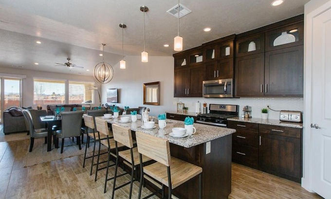7.5 miles from St. George Temple in Santa Clara, Paradise Village 78 l Desert Mountain Oasis BBQ Grill, Fire Pit, Community Resort Style Pool and Water Park provides accommodations with access to a hot tub and fitness room. With mountain views, this accommodation features a balcony. Pioneer Center for the Arts is 6.6 miles away and Daughters of Utah Pioneer Museum is 6.7 miles from the vacation home. With free Wifi, this 5-bedroom vacation home offers a cable TV, a washing machine, and a fully equipped kitchen with a dishwasher and oven. The accommodation has a fireplace. Jacob Hamblin House is 2.4 miles from the vacation home, while Brigham Young Winter Home Historical Site is 6.5 miles away. St. George Municipal Airport is 16 miles from the property.