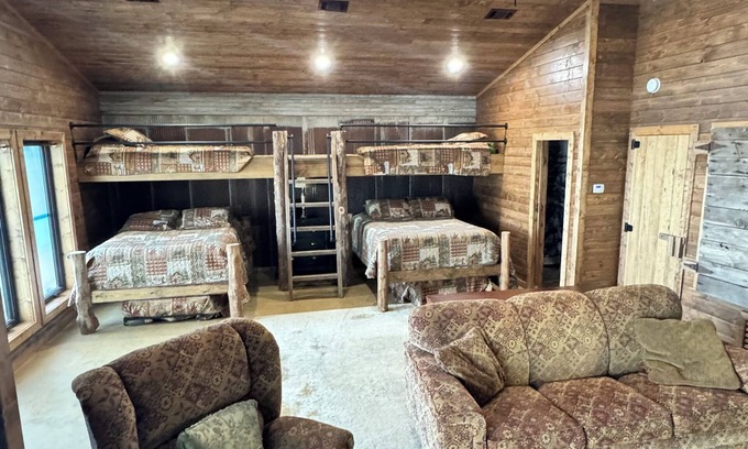 This fabulous spacious rustic cabin on Piney Bay Lamar is the perfect retreat for multiple guests. With 1 large room featuring 2 queen beds, 4 twin bed, sofa bed, and queen air mattress. Everyone will have a nice place to rest. Enjoy amenities like WiFi, a washing machine, heating, AC, and an iron during your stay. The bathroom is equipped with all the essentials you need. You're sure to make fantastic memories with a stay at our place. Located on 50+ private waterfront acres. over 2 acres of meditation trails with multiple additional camp sites.