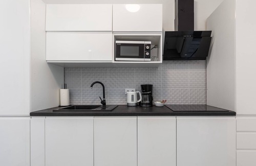 This fully equipped studio apartment can accommodate up to 4 people. It consists of a living room with a kitchenette and a bathroom with a toilet and a shower cubicle. The living area, equipped with comfortable sofas and a TV, as well as a spacious balcony with garden furniture, is an ideal place to enjoy your morning coffee or relax next to nature. Guests can take advantage of the high-speed free Wifi connection. A wide range of amenities and comprehensive furnishing of the apartment with the necessary kitchen and bathroom accessories and equipment guarantees a comfortable stay. To facilitate the start of each stay, a complimentary set of toiletries (soap, shampoo and shower gel), towels and linens are provided. In the apartment guests will find a washing machine, which will certainly be appreciated by families with small children or those planning a longer stay, as well as a crib and highchair for their little one. The property is decorated in white and gray, and is distinguished by careful finishing, aesthetics and functionality.