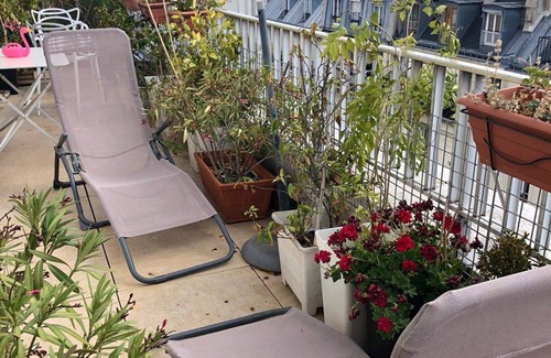 This Top Floor apartment comes with a 300 sq ft flowered, South oriented TERRACE over historic roofs of Paris, with a magic view, especially at sunset time : Eiffel Tower, Sacre Coeur, Bastille….
