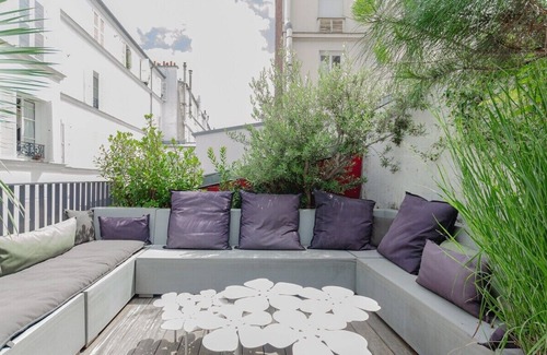 Renovated at the end of the 1980s, the neighborhood of the rue Montorgueil is an extension of Les Halles. Nowadays, its cobblestone streets are closed to traffic. Montorgueil is a market street with rows of market gardeners, cheesemakers and bakers: colors and scents reminiscent of country villages. In the surrounding streets you will find numerous restaurants and bars.Building and orientation This beautiful apartment is located on the 3rd floor of a Parisian building, directly accessible by the elevator and it faces south.Layout of the apartmentThe 7 rooms, including 6 spacious bedrooms, are divided between two floors. They all have a refined and clean style. The entrance opens up on a small entrance, directly opened on the large and bright living room. This beautiful living room can accommodate up to 12 people. A large fireplace gives a warm feeling to the atmosphere. The fully-equipped kitchen, opened on a beautiful dining room below glass roof provides a direct access to the large terrace. On the 3rd floor you will find a bedroom suite, with a bathroom and a 160 cm double bed. The toilets are separate. On the 4th floor, 3 bedrooms with a 140 cm double bed and one bedroom with a 140 cm sofa bed and two bathrooms are accessible through a large hallway where computers are at your disposal. The bedrooms have access to a long balcony. On the 5th floor, on the rooftops, you can enjoy your stay with family or friends with a last bedroom with two 90 cm single beds.