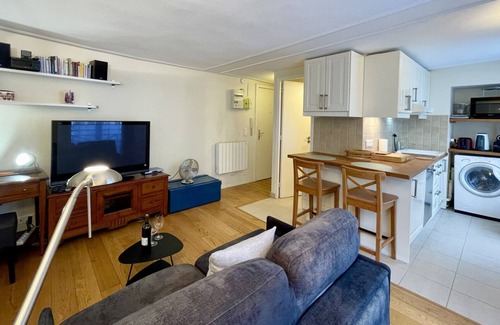Between the Opéra and Montorgueil, there is the vibrant business district of the Bourse. Once the working day is over, it becomes quiet. Come and admire the wonderful Galerie Vivienne, located between the Bourse and the Palais Royal, covered with an elegant skylight, entirely made of mosaics. Fashion and decoration boutiques have made it their home.Building and orientation In this small typical building, this studio is located on the 4th floor with no elevator. Layout of the apartmentTo access the apartment, you take a wooden staircase. Entering the apartment, there is a corridor and on the left, the bathroom. In the main room, you will find a large living room with a big LCD TV, a 120 cm convertible sofa and a little desk. At the end of this room you will find large closets with mirrors. Behind you, there is a dining table and an equipped kitchen. The two parts are linked by a wooden work surface in the form of an “L”. The kitchen has all the necessary equipment to cook delicious dishes: an oven, cooking utensils, a dishwasher… Coffee amateurs can choose between a classic coffee machine or a Nespresso machine. The bathroom includes a large shower cubicle and toilets. For your clothes, you can use a vapor pressing station and a washer dryer. Home Truths:-The communal area in this apartment is not the nicest. There is little light and some wires, however the interior of the apartment is great!