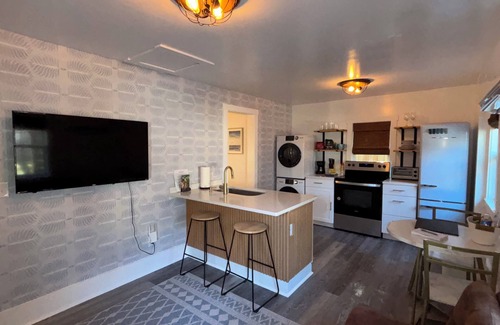 The Main Room is your Kitchen and Living Room all in one! The room contains a dining area, relaxation space, fully stocked kitchen and washer/dryer. The Main Room can become your own entertainment or relaxation area if you are looking to take a break from the heat (or cold) or want to relax after a long day outside!