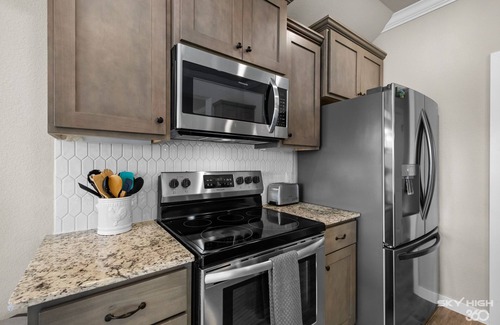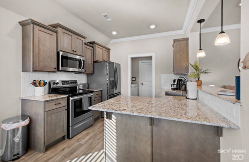 Stepping into the home you'll find an open entryway where you can drop your shoes and hang your coats. The entry leads into the open concept living/kitchen/dining area where the whole group can hang out and enjoy great company. The living room has a comfy couch and love seat where you can lounge and enjoy the large ROKU smart TV and cozy up to the gas fireplace on those cold nights. Gravitating to the beautiful brand new kitchen you'll find it fully stocked for all of your cooking and baking needs. Enjoy drip or Keurig coffee on us! We also have a large pantry for plenty of food storage during your stay. Our dining room accommodates 6 guests so the whole group can fit around the table for meals. With the large sliding glass doors there's plenty of natural light pouring into the whole kitchen/dining area. As you step out of those glass doors onto the covered patio you've got 4 cushioned patio chairs surrounding a propane fire pit so you can soak in the great outdoors while you stay. We also have a gas grill for guest use and a large, fully fenced, flat back yard.