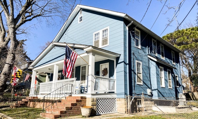This Naval Academy-themed 3 Bedroom home was just fully renovated and is ready to host Annapolis visitors! There are multiple outdoor spaces: a welcoming front porch, back deck overlooking nice big back yard, and parking. The main floor provides plenty of hangout space with a family room, large screen TV, dining table for 6 with a separate desk space, a full kitchen, with many new appliances, and a half bath. The second level features 3 bedrooms and a full bathroom.
