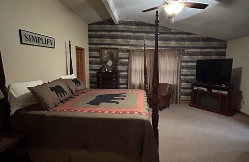 The master bedroom has its own electric fireplace with LCD. The game room has real arcade games including one that has over 25 different games to choose from. Parkway Creek has a wrap around driveway with plenty of parking for extra cars, trailers etc. I have had over 7 vehicles there at one time. The front of the house has an open deck with a view of the mountain & the rushing creek. The back porch is covered for shade or rainy days. Parkway Creek has a separate hot tub room outside that is completely covered & private with a 6 person Jacuzzi. Has a fire pit in lower backyard beside a creek for nightly warmth or marshmallow fun. The home is Nestled by the creeks to enjoy the cool mountains air and enjoy the sunrises and sunsets out over the beautiful Smoky Mountains! Privacy and comfort await you with this wonderful Lodge. You will surely want to spend time on the deck soaking in all the spectacular views as the nearby Elk stroll threw the yard! As you enter the Lodge, you will be charmed throughout as this house captures the Smoky Mountain dreams. Cozy and quaint with the comfort you look forward to for your vacation in the Smokies. The beautiful Buck Stove fireplace will give warmth on cool nights and there are plenty of warm blankets. The main floor has 2 bedroom's with a queen bedroom and a double bunk bed bedroom, one full bath, open living area & kitchen with an island. Large dining room is just off the main floor kitchen. The basement has a laundry room with washer & dryer. Spacious king bedroom in basement, full bath also located in basement. The game room is also located in the basement and has a ping pong table, retro arcade games, built in wall heater & a fold out couch. The open loft has a full bed & TV. The upstairs spacious master bedroom is furnished with a king bed and private bath . There is also a roll away bed & a pack n play for our smaller guest.