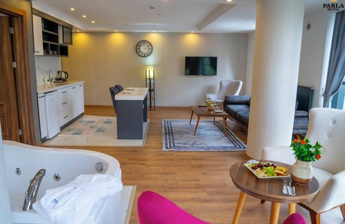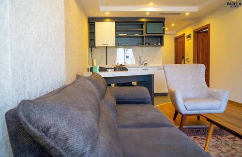 Parla Suite Hotel offers 32 air-conditioned accommodations with complimentary bottled water and slippers. Accommodations are furnished with double sofa beds, desk chairs, and dining tables. Beds feature down comforters and premium bedding. 40-inch Smart televisions come with premium satellite channels, first-run movies, and pay movies. Accommodations have kitchens with cookware/dishes/utensils. Rooms have detached private bathrooms. Bathrooms include bidets, hair dryers, and toothbrushes and toothpaste.