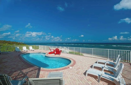 There are three master suites on the ground floor — two of which are direct oceanfront with sliding glass doors leading to the pool deck. The third includes a half bath. Upstairs, the grand primary suite offers over 900 square feet of living space, a king bed, and a private balcony with panoramic views of the ocean. Each bedroom includes a flat-screen TV, and the villa offers high-speed Wi-Fi throughout.