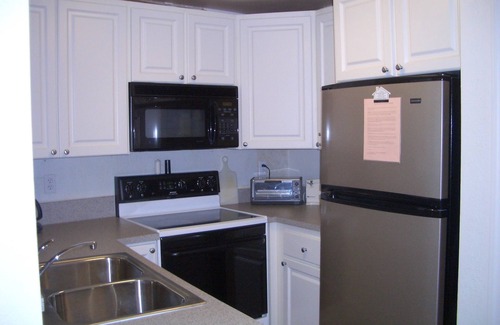 Updated kitchen with smooth top stove, full size refrigerator, built-in microwave & breakfast bar. 3 huge windows look directly at the beach (Gulf of Mexico - No Obstruction).