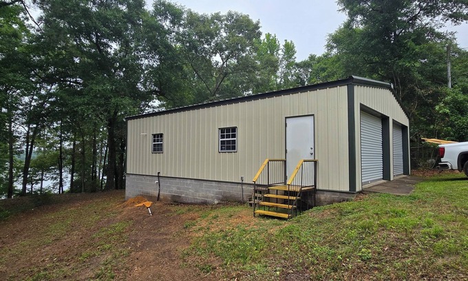This 508 sq ft Tiny Apt is inside a 30'x40' metal bldg. We built this apt so you could park (2) 21' boats inside and still have an awesome place to sleep. The main level has bedroom w/queen bed & upstairs loft w/ 2 twin beds. The kitchen has a fridge, microwave & range. The 4'x5' tiled walk-in shower is like one seen in a million-dollar home. A short walk down to the water is a dock w/75' walkway. A full RV/Camper hook-up w/20'x40' RV Barn, 50-amp power, water & septic (Additional fees apply).