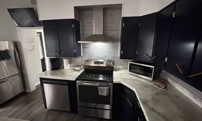 Newly renovated home. Large fully stocked kitchen (no fish frying in kitchen) living room with electric fire place, fitness room, laundry room with access to washer and dryer. 2 full baths, 3 bedrooms. 2 bedrooms up stairs with 1 queen bed, and 1 daybed with pull out trundle. 1 set of bunk beds-with full size bed on bottom and 1 twin on top and pull out trundle underneath. Downstairs bedroom has 1 queen bed with private bathroom. WiFi and Roku TV's in every room, with access to streaming services. An Air mattress is available for extra paid guests. Plenty of extra pillows and blankets throughout the home. Relax on the covered outdoor patio, with gas fire pit, TV, and 7 person hot tub. Please follow hot tub rules-card will be charged if hot tub is damaged or needs drained. Spacious driveway with car port. Parking on street available. Small yard with privacy fence. Access to grill and corn hole boards. NO FISH CLEANING ON PREMISES. Privacy fence has recently been added, so yard may be uneven in spots. Please be careful when walking in this part of the yard, as we continue to smooth these spots out and grass continues to grow.