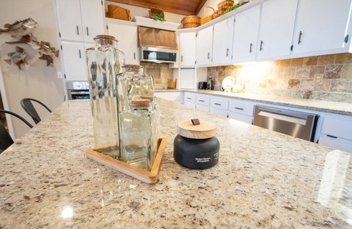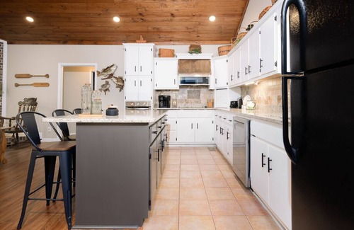 The heart of the cabin is its spacious living area, featuring plush seating and large windows that fill the room with natural light and offer picturesque views of the lake. The 75" tv is a bonus for movie night or cheering for your favorite team. The fully equipped kitchen has granite countertops and is ready for your culinary exploits, whether it's frying up today's catch or preparing a family feast.