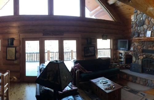 I have a Four season hand-scribed log home on Little Bass lake on a private 5.0 acre lot at end of dead end road. Only 1 distant neighbor. Interior finished with knotty pine ceiling and Australian Cyprus wood floors, and Tamarack paneling. Huge Lake superior stone real fireplace with firewood provided. Full kitchen including fridge, freezer, dishwasher, microwave, stove, oven and center island and all the utensils for cooking. Watch the stars and northern lights from the large deck facing the quiet bay at the South end of Little Bass Lake. There is good fishing right from docks. A-Frame vaulted ceilings with master BR and bath in loft. Main floor has 2 large bedrooms, full bathroom, kitchen and great room and has a 4 season porch that is great for family meals any time of year. The walkout basement is unfinished but there are laundry facilities and an elliptical for use by guests.