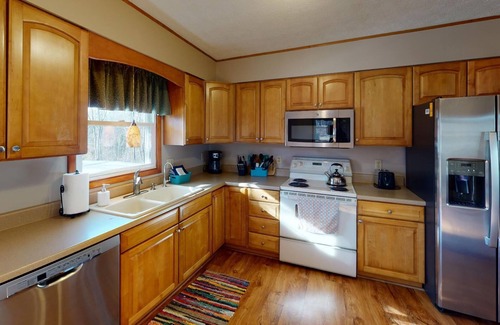 The kitchen includes a full-sized range, refrigerator with water filter and icemaker, dishwasher, microwave, coffee maker, and cooking utensils and tableware. A large table allows for fun, family meals, and a place to gather for games and entertainment.