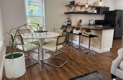 Open concept kitchen with bar seating, brand new appliances, including dishwasher and refrigerator with water filtration system. Dining table and bar each seat 4.