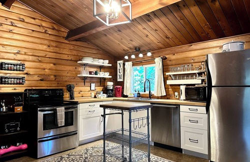 The full kitchen includes a stove, refrigerator, microwave, coffee maker, newly added dishwasher, and all essential cookware. Gather around the table for four to enjoy a hearty meal or a quiet morning coffee by the fire.