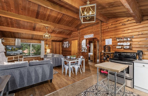 Two private bedrooms each feature a comfortable queen-size bed with soft linens and rustic charm—perfect for restful nights after mountain adventures. There is also a queen size sofa sleeper in the living area.