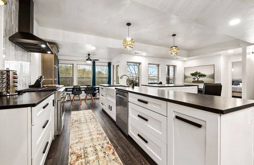 Upon entering our home, you'll be greeted by our main lounge space and kitchen area. This open-concept space boasts stunning modern design, colorful accents and huge windows overlooking Beaver Lake. In the lounge, you'll find two massage chairs and a 75-inch LG Smart TV. Directly behind this, you'll see our kitchen as well as THREE separate dining areas. Our kitchen is fully stocked with everything you'll need, including a Samsung Smart Fridge, Hamilton Beach Flex Brew coffee maker and Monogram stove. Directly in front of the kitchen, you'll see our bar with 4 barstools and to the right and left of our kitchen, you'll see our two 6-top dining tables.