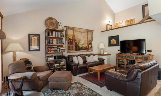 The inviting living area features plush leather seating, vaulted ceilings, a large flat-screen TV, and a well-stocked bookshelf — perfect for relaxing after exploring nearby beaches, towns, or trails. The updated kitchen is equipped with stainless steel appliances, a wine cooler, and everything you need for at-home meals.