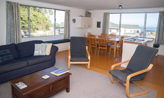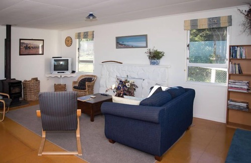 Is situated on the Wairarapa coast in the middle of a family owned working sheep, beef and deer farm. Historically it was built to house the 8 shepherds who worked on Glenburn when it was some 16,000 acres in size. In 2010 it was renovated to operate as holiday accommodation, it now sleeps 11, a kitchen and dining area was created in the large lounge. Window seating and a comfortable couch with numerous cane chairs surround the TV / DVD and wood burner making a cosy space.