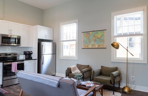 You will have a private entrance with contactless check-in using a unique door code. The door is located on the front of the rear building, meaning you will walk past the main house and to the carriage house. Don't worry, lights will be on along the path and above the door in case you are coming and going at night. All three rooms are in a large room with tall ceilings and ample natural light. In this room, you will find a 50-inch television, a classic record player, a dining table, and a kitchen with all of your basic cooking needs. We will provide tea and coffee packets along with sugar and creamer. You will sleep soundly in our extremely comfortable queen bed surrounded by plenty of natural light in the window-lined bedroom. This room has a standing mirror in case you need to get ready along with a dresser and closet for clothes. IN the closet are extra linens, pillows, cleaning supplies, and the iron and board. You'll also have a small desk to work from. The bathroom is well lit and very spacious. We provide shampoo, conditioner and body wash in a wall dispenser in the shower. There is also a standing washer and dryer with a clothes hamper in the bathroom. Detergent is located under the sink as is the hairdryer.