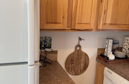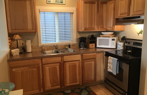 Kitchens are located on both levels of the home. The upstairs kitchen is fully equipped with a large selection of new dish-ware, silverware, cutlery, both teflon and stainless cookware, serving and mixing bowls, shellfish utensils, coffee makers, coffee grinder, pizza cutter, cutting boards, blender, hand mixer, crockpot, microwave, and most anything else the chef needs for meal preparation. There are chilled martini and beer glasses ready to go in the freezer. The downstairs kitchen has an additional full size fridge, microwave and range as well as counter space, cupboards and a sink to assist with food storage and prep if needed. All utensils and dishes are located in the upstairs kitchen.