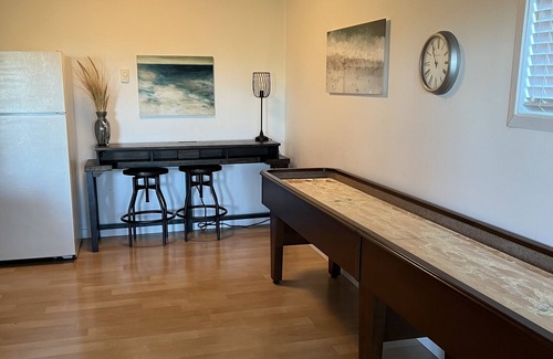 Lower level entertainment area is complete with oversized, comfy furniture, and a big screen smart TV-perfect for late night movie watching after a day at the beach. Games, cards, and DVD's are also stored downstairs and the area is complete with a 12 foot Brunswick shuffle board table.