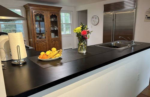 This beautiful home offers 4 bedrooms, 2 bathrooms, newly renovated gourmet kitchen with many kitchen utensils, large yard lakeside with a private 30 ft dock. There is also a canoe with life vests in the attached garage. Lots of room for yard games and a fire pit. For those occasional less than perfect days there are board games and a video library. We also have internet and cable. There are air conditioners for warm days. The large deck overlooking the lake is the perfect place to relax or prepare a meal on the BBQ.