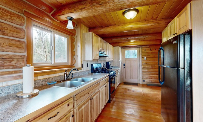 Ideal for a romantic getaway or a small family vacation, this two-story, off-grid cabin offers classic, rustic comforts, like wells, a septic tank, and solar power, alongside a number of desirable amenities. Prepare all your favorite recipes in the well-equipped, full kitchen, then gather for meals at the adjacent table - perfect for rainy day board games! After exciting days out, return home, get a fire going in the wood stove, and settle in for a quiet evening together with hot drinks and great conversation. The addition of a desk and chair also offers a quiet place to sit and do a little writing.