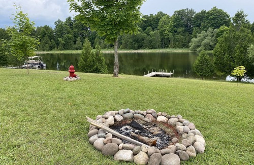 Getaway cabin with 418’ of Black River frontage on the inland waterway. Travel by any type of vehicle down a well-maintained two-track to serenity. Fish, swim, boat and enjoy the peaceful views around a campfire. Restaurants, Mackinac Island, and ORV trail systems all nearby!!! Two bedrooms with queen beds and a large sectional couch (sleeps four adults comfortably, with extra room on section, ideal for children). Fully stocked kitchen and outdoor grill. Towels, bedding, and basic needs provided. Mini-split A/C and heat unit will make your stay comfortable from early Spring to late Fall. The whole property is yours throughout your stay, with large yard areas surrounding the cabin, great for children and pets are welcome for a pet fee. Two docks available for use for boating, swimming, and fishing.